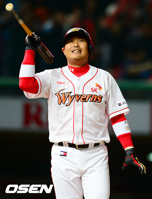 16일 오후 인천 문학구장에서 열린 2012 팔도 프로야구 플레이오프 1차전 SK 와이번스와 롯데 자이언츠의 경기 3회말 2사 주자 만루 SK 이호준이 타석에서 삼진아웃을 당한 후 아쉬워하고 있다.