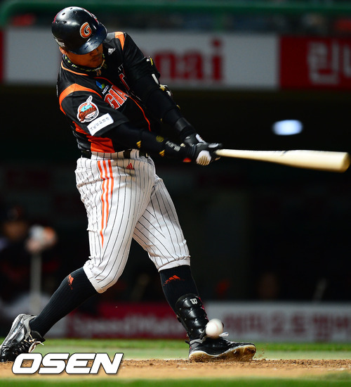 16일 오후 인천 문학구장에서 열린 2012 팔도 프로야구 플레이오프 1차전 SK 와이번스와 롯데 자이언츠의 경기 4회초 1사 주자 없는 상황에서 롯데 홍성흔이 자신의 파울타구에 발을 맞고 있다.