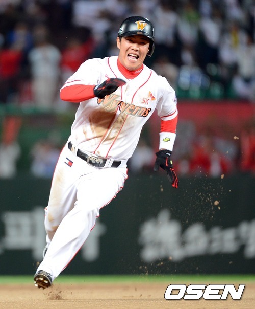 16일 오후 인천 문학구장에서 열린 2012 팔도 프로야구 플레이오프 1차전 SK 와이번스와 롯데 자이언츠의 경기, 3회말 2사 1루 박재상의 안타때 1루주자 정근우가 3루로 달리고 있다.