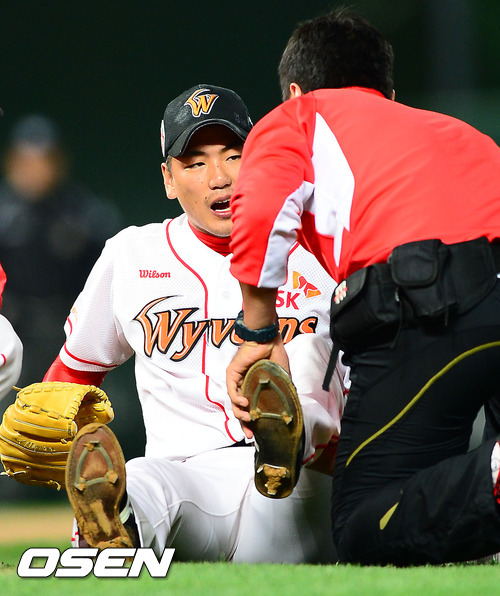 16일 오후 인천 문학구장에서 열린 2012 팔도 프로야구 플레이오프 1차전 SK 와이번스와 롯데 자이언츠의 경기 5회초 2사 주자 없이 롯데 문규현 타석에서 SK 선발 김광현이 다리에 근육경련이 일어나 마사지를 받고 있다.