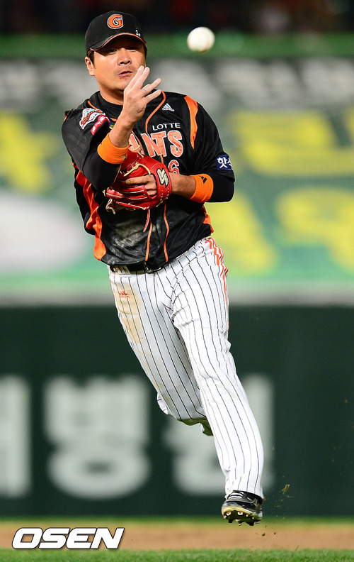 16일 오후 인천 문학구장에서 열린 2012 팔도 프로야구 플레이오프 1차전 SK 와이번스와 롯데 자이언츠의 경기 5회말 2사 주자 없는 상황에서 SK 정근우의 유격수 앞 땅볼때 롯데 유격수 문규현이 1루로 몸을 날리며 송구하고 있다.