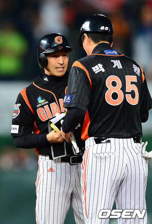 16일 오후 인천 문학구장에서 열린 2012 팔도 프로야구 플레이오프 1차전 SK 와이번스와 롯데 자이언츠의 경기 6회초 1사 주자 1루 롯데 손아섭이 좌익수 뒤 1타점 동점 적시타를 날린 후 2루에서 박계원 코치와 하이파이브를 하고 있다.