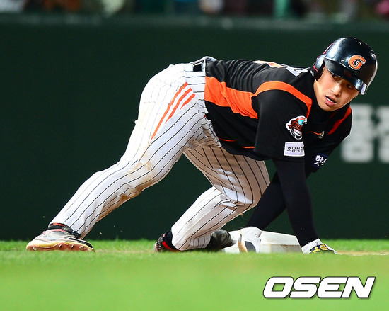16일 오후 인천 문학구장에서 열린 2012 팔도 프로야구 플레이오프 1차전 SK 와이번스와 롯데 자이언츠의 경기 6회초 1사 주자 2루 롯데 홍성흔의 좌익수 앞 1루타때 2루 주자 손아섭이 홈으로 향하려다 3루로 귀루하고 있다.