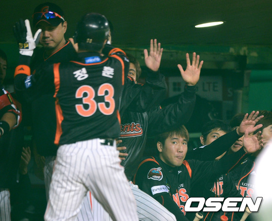 16일 오후 인천 문학구장에서 열린 2012 팔도 프로야구 플레이오프 1차전 SK 와이번스와 롯데 자이언츠의 경기, 6회초 1사 1루 롯데 손아섭이 좌전 동점 적시타때 홈을 밟은 1루주자 정훈이 더그아웃에서 동료들과 환호하고 있다.