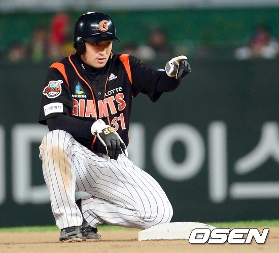 16일 오후 인천 문학구장에서 열린 2012 팔도 프로야구 플레이오프 1차전 SK 와이번스와 롯데 자이언츠의 경기, 6회초 1사 1루 손아섭이 동점 2루타를 치고 좋아하고 있다.