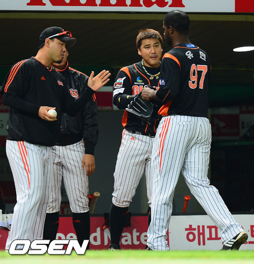16일 오후 인천 문학구장에서 열린 2012 팔도 프로야구 플레이오프 1차전 SK 와이번스와 롯데 자이언츠의 경기 6회말 1사 주자 1루 이호준 타석에서 롯데 선발 유먼이 교체되고 있다.