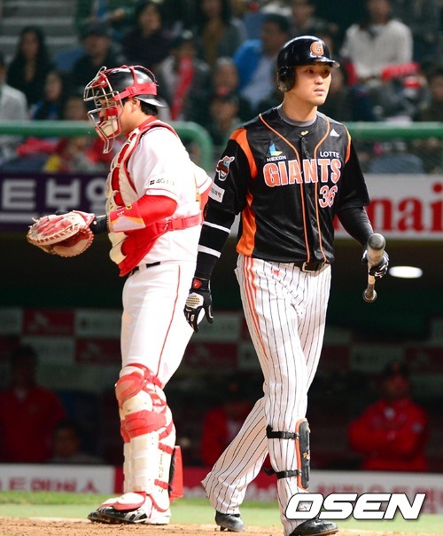 16일 오후 인천 문학구장에서 열린 2012 팔도 프로야구 플레이오프 1차전 SK 와이번스와 롯데 자이언츠의 경기, 6회초 1사 1,3루 박종윤이 박준서로 교체되고 있다.