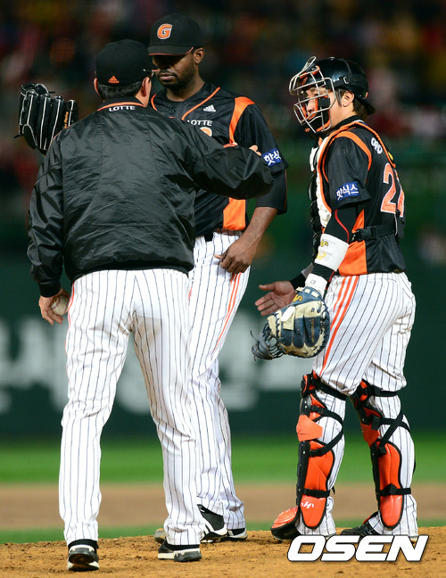 16일 오후 인천 문학구장에서 열린 2012 팔도 프로야구 플레이오프 1차전 SK 와이번스와 롯데 자이언츠의 경기, 6회말 1사 1루 SK 이호준 타석때 롯데 유먼이 마운드를 내려가고 있다.