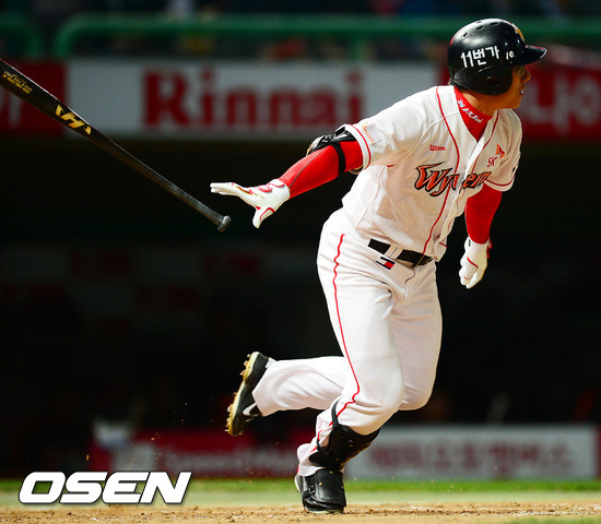 16일 오후 인천 문학구장에서 열린 2012 팔도 프로야구 플레이오프 1차전 SK 와이번스와 롯데 자이언츠의 경기 6회말 2사 주자 3루 SK 박정권이 좌익수 앞 1타점 적시타를 날리고 있다.