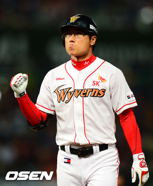 16일 오후 인천 문학구장에서 열린 2012 팔도 프로야구 플레이오프 1차전 SK 와이번스와 롯데 자이언츠의 경기 6회말 2사 주자 3루 SK 박정권이 좌익수 앞 1타점 적시타를 날린 후 1루에서 주먹을 불끈 쥐고 있다.