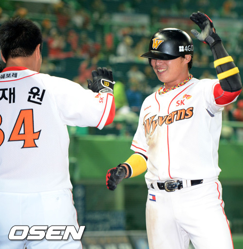 16일 오후 인천 문학구장에서 열린 2012 팔도 프로야구 플레이오프 1차전 SK 와이번스와 롯데 자이언츠의 경기 6회말 2사 주자 3루 SK 박정권의 좌익수 앞 1타점 적시타때 홈을 밟은 박재상이 덕아웃에서 동료들과 기쁨을 나누고 있다.