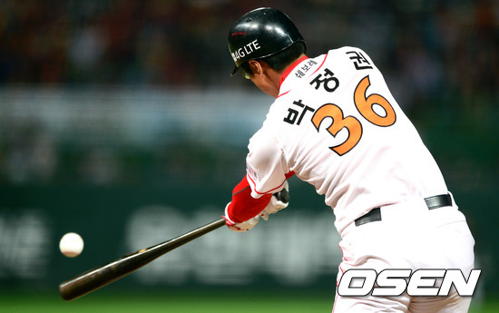 16일 오후 인천 문학구장에서 열린 2012 팔도 프로야구 플레이오프 1차전 SK 와이번스와 롯데 자이언츠의 경기, 6회말 2사 2루 SK 박정권이 좌전 적시타를 치고 있다.