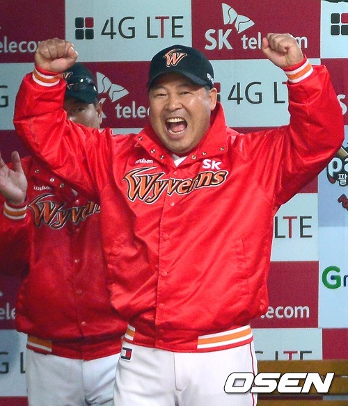 정우람이 마지막 타자 전준우를 외야플라이로 처리하자 이만수 감독이 환호하고 있다./spjj@osen.co.kr