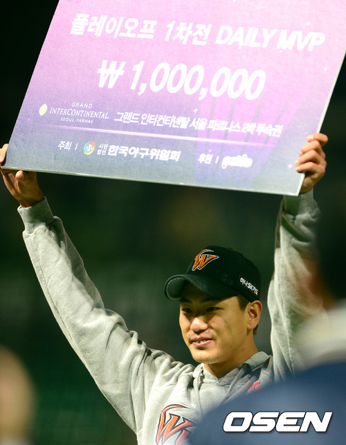 경기 종료 후 SK 김광현이 DAILY MVP를 수상하고 세리머니를 펼치고 있다. /sunday@osen.co.kr