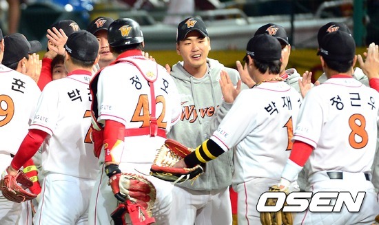 정우람이 마지막 타자 전준우를 외야플라이로 처리하고 선수들과 마운드에 모여 승리의 기쁨을 나누고 있다./spjj@osen.co.kr