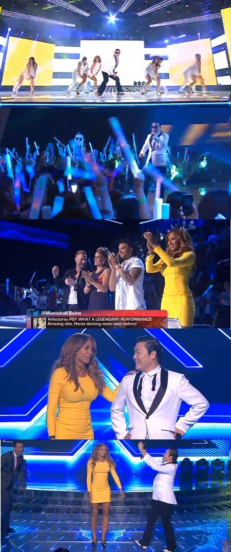 싸이는 16일 오후 7시30분(현지시간) 방송된 호주 인기 오디션 프로그램 '엑스팩터 오스트레일리아'에서 '강남스타일'을 부르고, 심사위원으로 자리했던 스파이스걸스의 브라운과 말춤을 췄다.