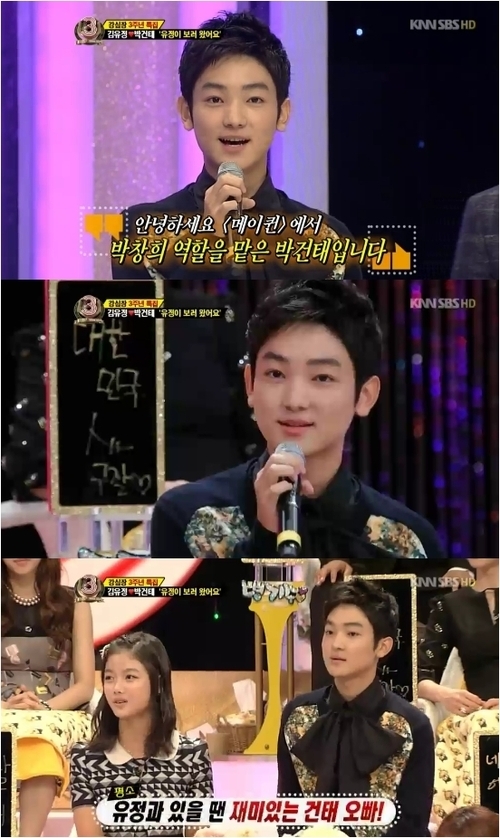 김유정의 고백에 MC 신동엽은 “유정 양이 건태 군을 좋아하는 것이 아니냐”고 짓궂게 물었고 김유정은 미소를 짓기만 했다. 그리고 박건태가 깜짝 등장, 김유정은 얼굴까지 붉어지며 당황했다.