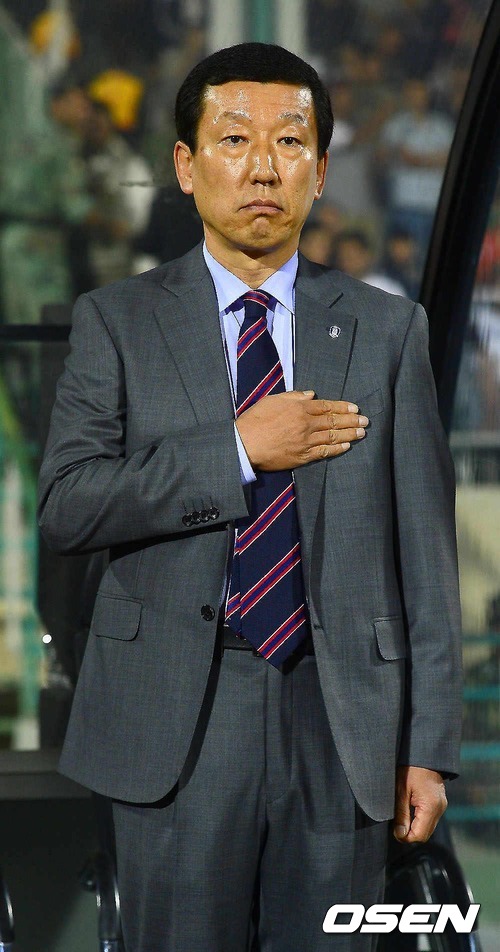 17일 새벽(한국시간) 이란 테헤란 아자디 스타디움에서 열린 '2014 브라질 월드컵 최종예선' 4차전 한국과 이란의 경기 식전행사에서 최강희 감독이 국그에 대한 예를 하고 있다.