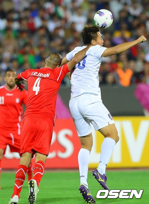 17일 새벽(한국시간) 이란 테헤란 아자디 스타디움에서 열린 '2014 브라질 월드컵 최종예선' 4차전 한국과 이란의 경기 전반 김신욱이 공중볼을 다투고 있다.