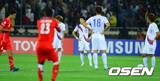 17일 새벽(한국시간) 이란 테헤란 아자디 스타디움에서 열린 '2014 브라질 월드컵 최종예선' 4차전 한국과 이란의 경기 후반 네쿠탐에 일격을 당한 한국 선수들이 아쉬운 표정을 짓고 있다.