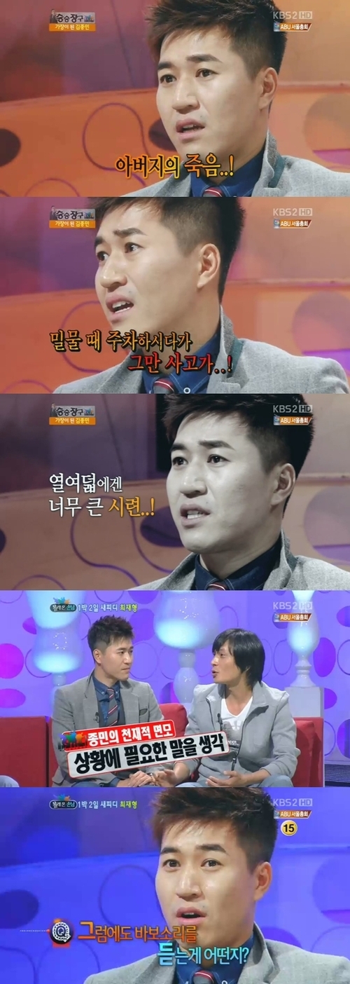 이날 ‘승승장구’에는 김종민이 과거 아버지의 사망이후 방황했던 시절의 얘기를 풀어내며 숨겨놨던 가족사를 공개했고, 진솔한 예능인으로서의 면모를 보여 시청자들의 박수를 받았다.