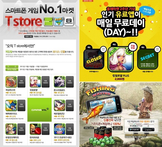 스마트폰 게임의 인기가 확산되고 있는 가운데 게임빌의 대규모 이벤트 폭격이 시작됐다. 게임빌이 국내 이동통신 3사 오픈 마켓과 함께 3색 프로모션을 진행한다. T스토어, olleh 마켓, U+ 앱마켓의 세 가지 색깔로 동시에 진행되는 대규모 이벤트라서 모바일게임 팬들의 이목이 더욱 집중될 것으로 보인다.