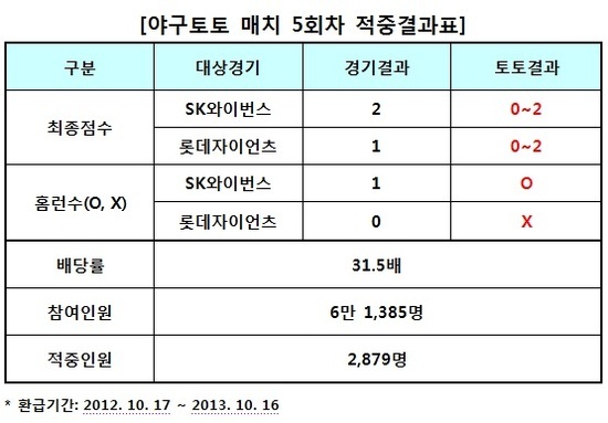 적중자 가운데 최대 베팅금액인 10만원을 베팅한 1명의 야구팬은 이번 회차 최고액인 315만원의 적중상금을 받게 됐고, 최소 베팅금액인 100원을 베팅한 507명의 적중자들에게는 각각 3150원씩 환급금이 주어진다.