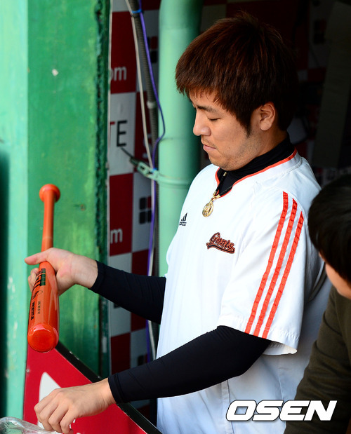 17일 오후 인천 문학구장에서 열린 2012 팔도 프로야구 플레이오프 2차전 SK 와이번스와 롯데 자이언츠의 경기, 경기에 앞서 롯데 강민호가 배트의 비닐 포장을 뜯고 있다.