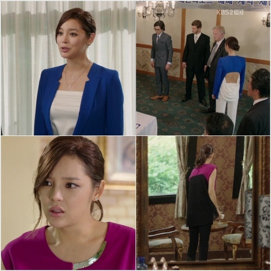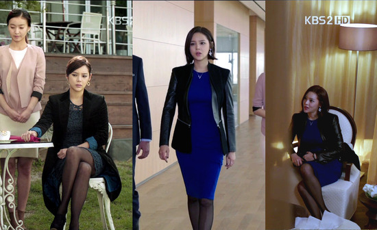 짙은 푸른색의 레이스 원피스와 벨벳 소재의 조셉 블랙 롱 재킷을 매치하거나, 밝은 푸른 원피스에 블랙 레더 재킷을 매치하는 식이다. 페미닌하면서도 절도있는 스타일이 단발머리로 변신한 박시연에게 카리스마를 더해준다.