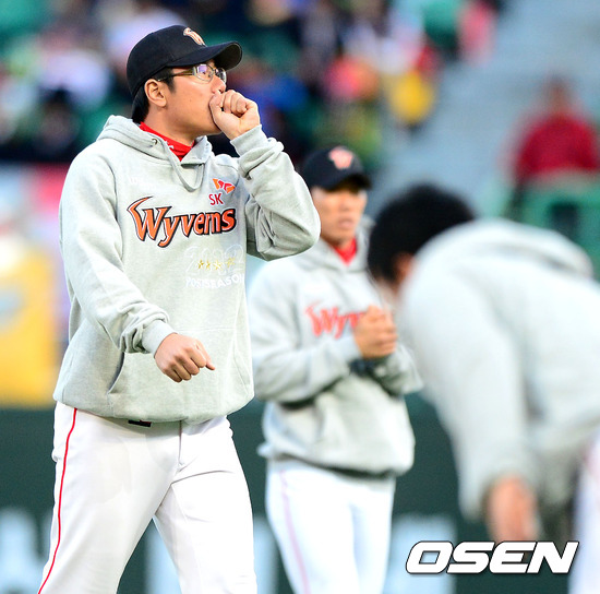 17일 오후 인천 문학구장에서 열린 2012 팔도 프로야구 플레이오프 2차전 SK 와이번스와 롯데 자이언츠의 경기, 경기에 앞서 SK 박정권이 스트레칭 훈련을 하며 손에 입김을 불고 있다.