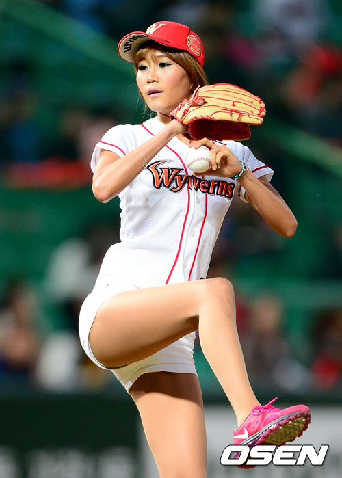 17일 오후 인천 문학구장에서 열린 2012 팔도 프로야구 플레이오프 2차전 SK 와이번스와 롯데 자이언츠의 경기, 경기에 앞서 SK 배지현 치어리더가 시구를 하고 있다.