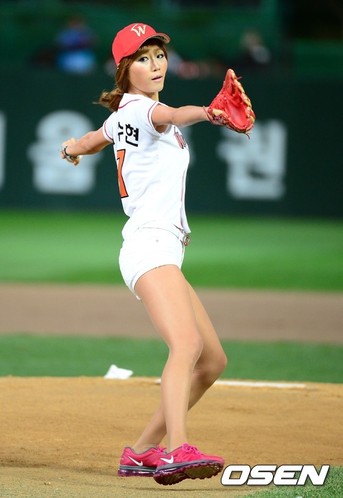 17일 오후 인천 문학구장에서 열린 2012 팔도 프로야구 플레이오프 2차전 SK 와이번스와 롯데 자이언츠의 경기, 경기에 앞서 SK 치어리더 배수현이 멋진 폼으로 시구를 하고 있다.