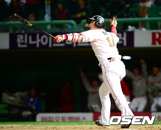 17일 오후 인천 문학구장에서 열린 2012 팔도 프로야구 플레이오프 2차전 SK 와이번스와 롯데 자이언츠의 경기, 1회말 1사 1루 최정이 좌측 담장을 넘기는 투런 홈런을 치고 있다.