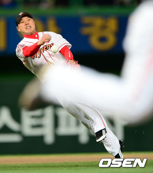 17일 오후 인천 문학구장에서 열린 2012 팔도 프로야구 플레이오프 2차전 SK 와이번스와 롯데 자이언츠의 경기, 1회초 1사 SK 박진만이 롯데 손아섭의 땅볼 타구를 잡아 1루로 송구하고 있다.