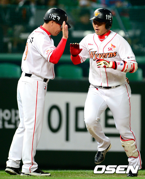 17일 오후 인천 문학구장에서 열린 2012 팔도 프로야구 플레이오프 2차전 SK 와이번스와 롯데 자이언츠의 경기, 1회말 1사 1루 SK 최정이 좌월 선제 투런홈런을 치고 그라운드를 돌고 있다.