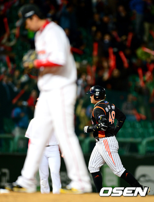 17일 오후 인천 문학구장에서 열린 2012 팔도 프로야구 플레이오프 2차전 SK 와이번스와 롯데 자이언츠의 경기, 2회초 무사 롯데 홍성흔이 좌중월 솔로홈런을 치고 그라운드를 돌고 있다.