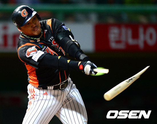17일 오후 인천 문학구장에서 열린 2012 팔도 프로야구 플레이오프 2차전 SK 와이번스와 롯데 자이언츠의 경기, 4회초 무사 롯데 홍성흔의 타격때 배트가 부러지고 있다.