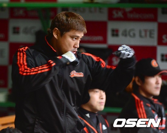 17일 오후 인천 문학구장에서 열린 2012 팔도 프로야구 플레이오프 2차전 SK 와이번스와 롯데 자이언츠의 경기, 경기 전 홍성흔이 복싱 하는 폼을 잡고 있다.