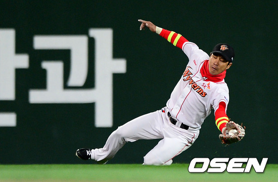 17일 오후 인천 문학구장에서 열린 2012 팔도 프로야구 플레이오프 2차전 SK 와이번스와 롯데 자이언츠의 경기, 5회초 1사 SK 김강민이 롯데 김주찬의 타구를 잡고 있다.