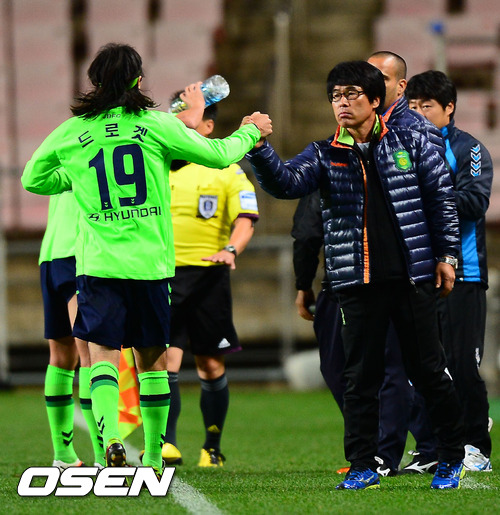 17일 저녁 울산문수축구경기장에서 열린 '현대오일뱅크 K리그 2012' 36라운드 울산 현대와 전북 현대의 경기에서 전반 전북 드로겟이 몸을 날리며 슛, 추가골에 성공한 후 이흥실 감독 대행과 하이파이브를 하고 있다.