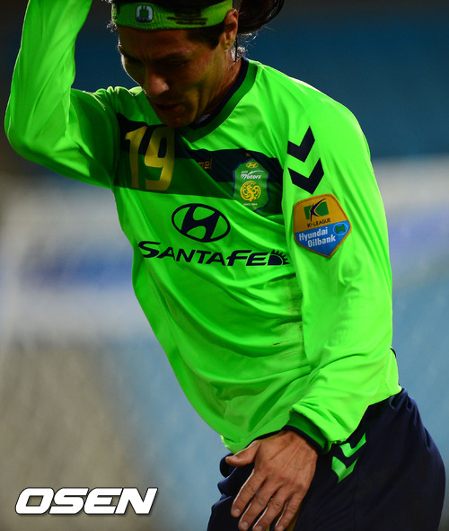 17일 저녁 울산문수축구경기장에서 열린 '현대오일뱅크 K리그 2012' 36라운드 울산 현대와 전북 현대의 경기에서 전반 전북 드로겟이 몸을 날리며 슛, 추가골에 성공한 후 점프하며 기뻐하고 있다.