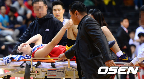 17일 오후 고양 체육관에서 열린 'KB 국민카드 2012-2013 프로농구' 고양 오리온스와 창원 LG의 경기 3쿼터 오리온스 조효현이 수비를 하던중 착지 불안정으로 무릎 통증을 호소해 들것에 실려 병원으로 이송되고 있다.