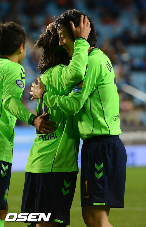 17일 저녁 울산문수축구경기장에서 열린 '현대오일뱅크 K리그 2012' 36라운드 울산 현대와 전북 현대의 경기에서 전반 전북 드로겟이 몸을 날리며 추가골에 성공한 후 이승현과 포옹을 하고 있다.