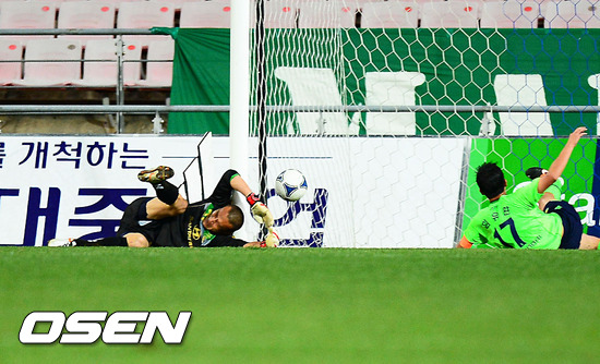 17일 저녁 울산문수축구경기장에서 열린 '현대오일뱅크 K리그 2012' 36라운드 울산 현대와 전북 현대의 경기에서 전반 울산 고슬기의 슛을 전북 최은성 골키퍼가 아깝게 막아내지 못하고 있다.