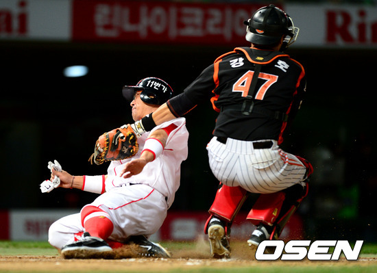 17일 오후 인천 문학구장에서 열린 2012 팔도 프로야구 플레이오프 2차전 SK 와이번스와 롯데 자이언츠의 경기, 6회말 2사 1,2루 모창민의 중전안타때 2루주자 조인성이 홈으로 쇄도했지만 포수 강민호에게 태그아웃 되고 있다.