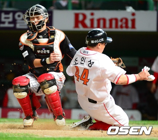 17일 오후 인천 문학구장에서 열린 2012 팔도 프로야구 플레이오프 2차전 SK 와이번스와 롯데 자이언츠의 경기, 6회말 2사 1,2루 정근우의 안타때 2루주자 조인성이 홈을 파고들었지만 아웃되고 있다.