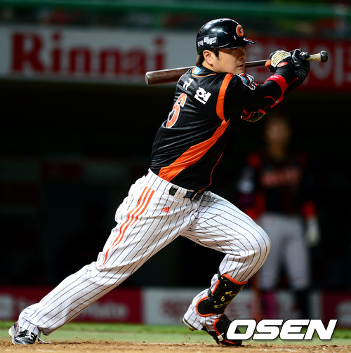 17일 오후 인천 문학구장에서 열린 2012 팔도 프로야구 플레이오프 2차전 SK 와이번스와 롯데 자이언츠의 경기, 7회초 1,3루 롯데 문규현이 내야땅볼을 치고 있다. 그 사이 3루주자 전준우가 홈을 밟고 득점에 성공했다.