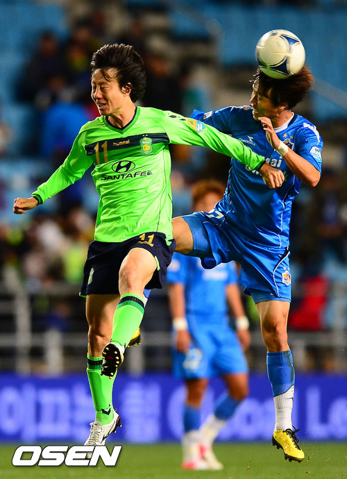 17일 저녁 울산문수축구경기장에서 열린 '현대오일뱅크 K리그 2012' 36라운드 울산 현대와 전북 현대의 경기에서 전반 울산 강진욱이 전북 이승현에게 연결된 볼을 공중에서 차단하고 있다.