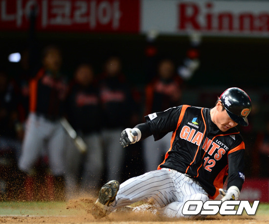 17일 오후 인천 문학구장에서 열린 2012 팔도 프로야구 플레이오프 2차전 SK 와이번스와 롯데 자이언츠의 경기,7회초 1사 2루 롯데 조성환의 중전 동점 적시타때 2루주자 김주찬이 홈을 밟고 있다.