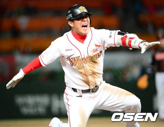 17일 오후 인천 문학구장에서 열린 2012 팔도 프로야구 플레이오프 2차전 SK 와이번스와 롯데 자이언츠의 경기,7회말 무사 정근우가 3루타를 치고 환호하고 있다.